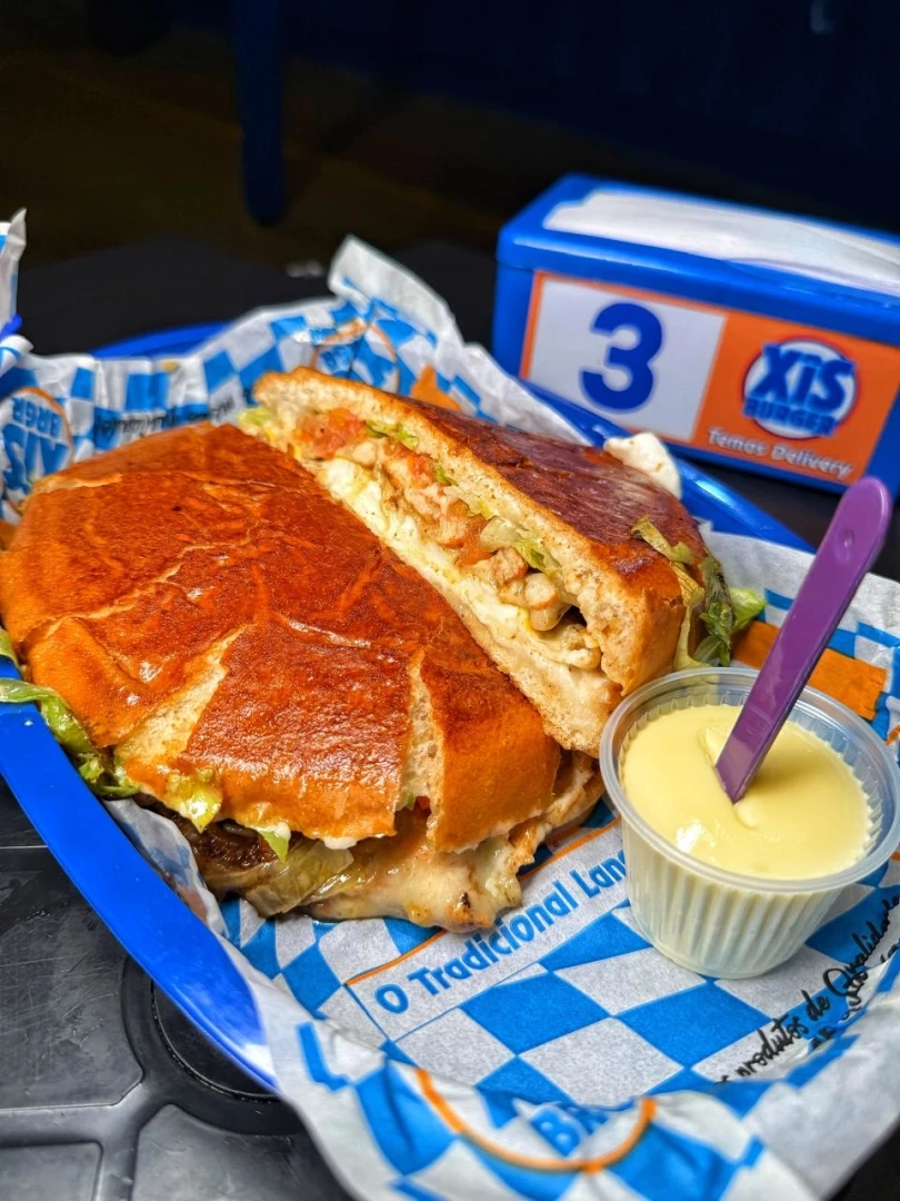 Filé de frango em iscas, bacon, 2 salsichas , 2 ovos juntos, milho, batata palha, queijo mussarela, alface e tomate em cubos, maionese caseira no pão prensado.