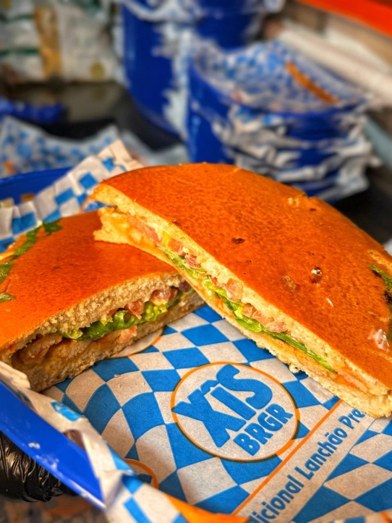 Filé de frango em iscas, bacon, 2 salsichas , 2 ovos juntos, milho, batata palha, queijo mussarela, alface e tomate em cubos, maionese caseira no pão prensado.
