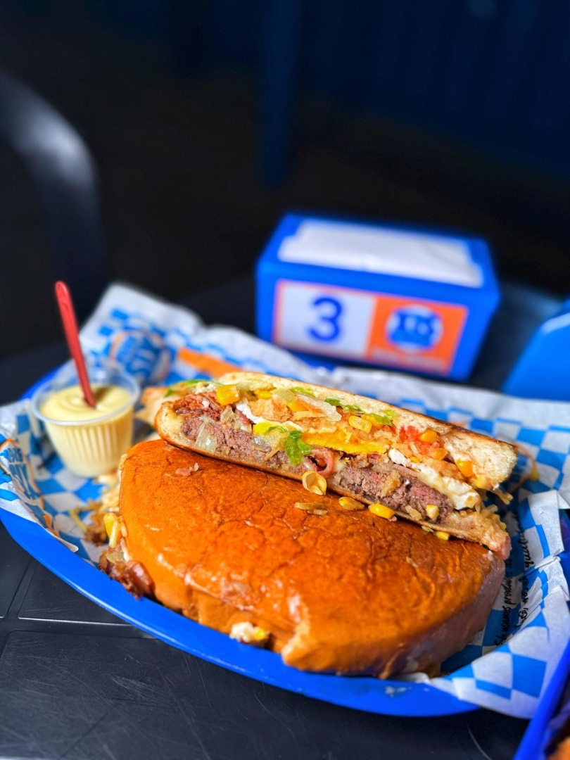 Burger bovino, calabresa, cebola dourada na chapa, queijo mussarela, Milho, Batata palha, alface e tomate em cubos, maionese caseira no pão prensado.