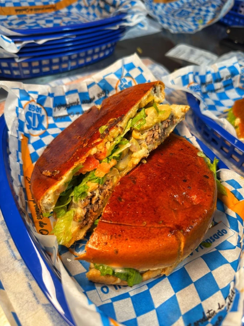 Burger bovino, calabresa, cebola dourada na chapa, queijo mussarela, Milho, Batata palha, alface e tomate em cubos, maionese caseira no pão prensado.