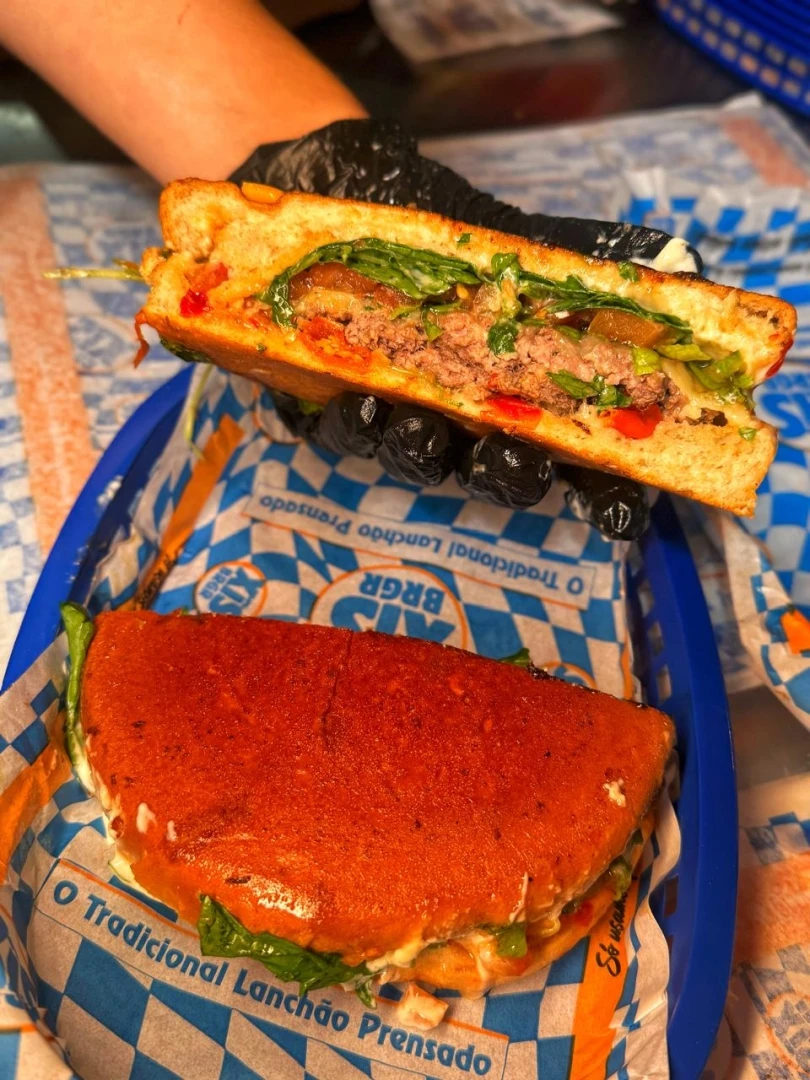 Burger, bacon, queijo mussarela, 2 salsichas, 2 ovos juntos, calabresa, milho, azeitona verde, Batata palha, alface e tomate em cubos, maionese caseira e batata palha no pão prensado.